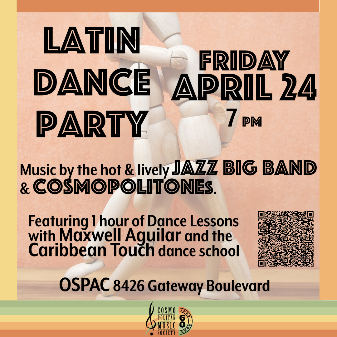 It's time to dance! Join the Cosmopolitan Music Society Jazz Big Band and Cosmopolitones with special guest, dance instructor extraordinaire, Maxwell Aguilar, in an evening of hot and lively music...
