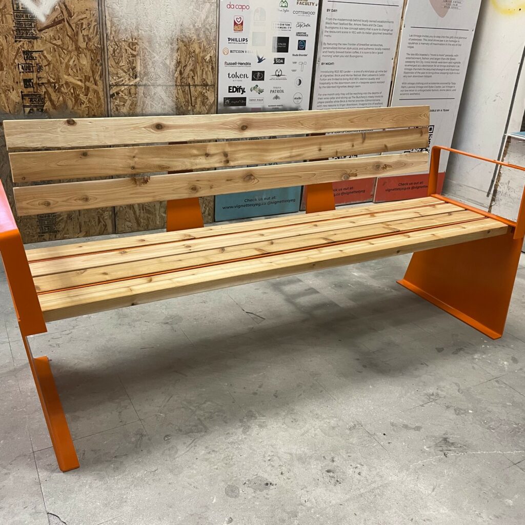 In 2022, we initiated our largest placemaking project yet, with a $250,000 investment into the creation and installation of permanent street furniture, like bike racks, benches, bistro tables, and parklets. This investment into the community was made possible through the Canada Community Revitalization Fund (CCRF), which is administered by Prairies Economic Development Canada.