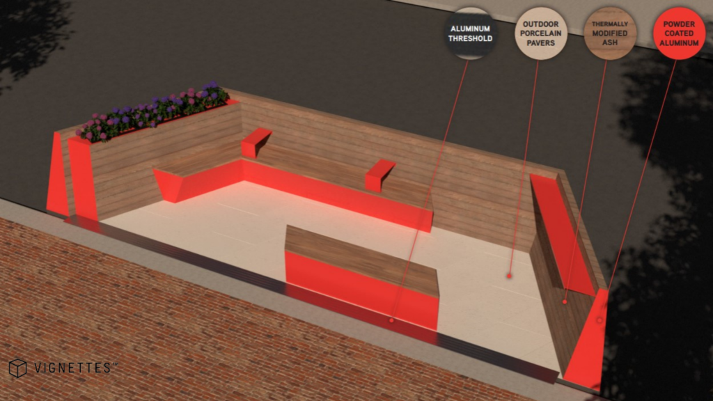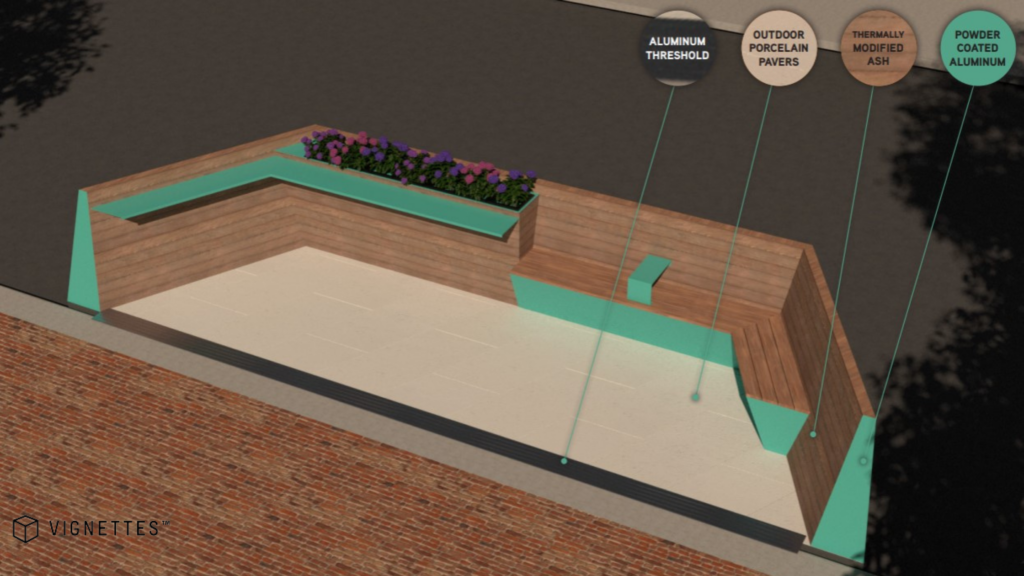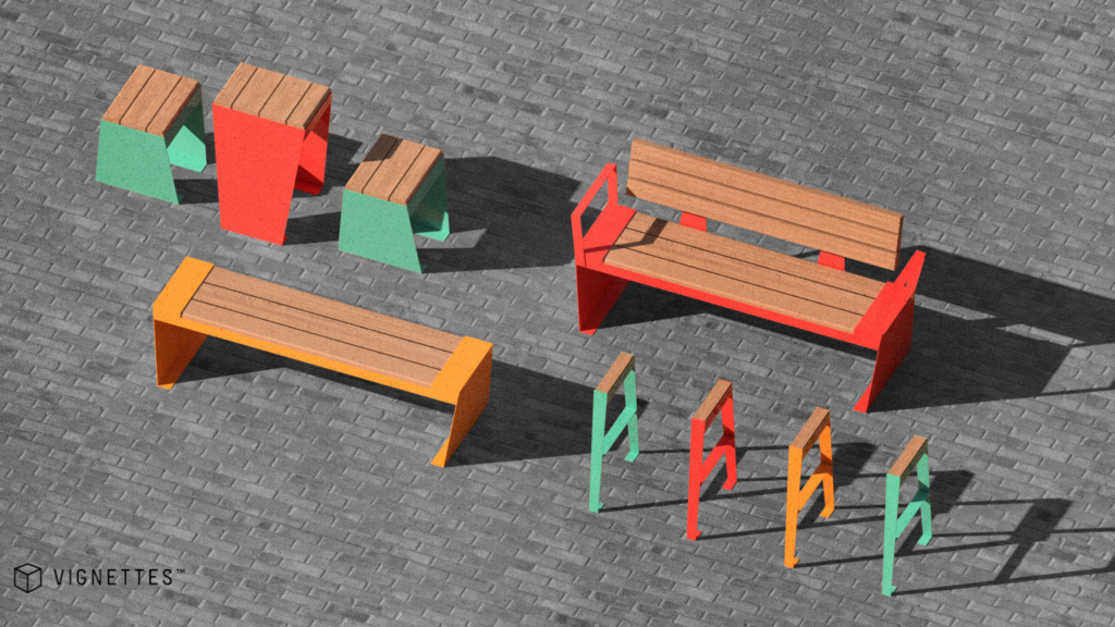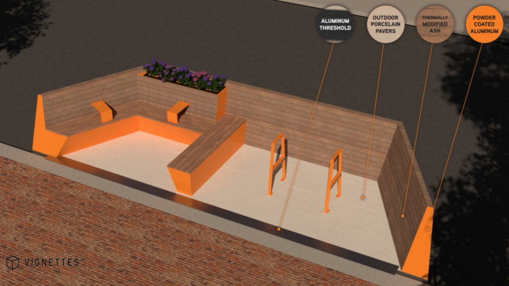 Here is a look at some renderings showing the design of the new benches, bike racks, and parklets - all being designed and manufactured locally! These are renderings only, and the final design, color and material specifications may differ from what is pictured here.